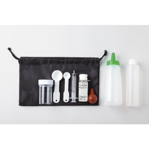 セット内容 土壌用容器、計量スプーン(大1、小1)、採水器、チップカッター、ゴム球、注水器、廃棄用ボトル