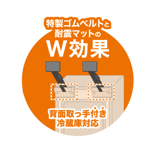 2タイプ展開で幅広い冷蔵庫に対応。-背面タイプ:冷蔵庫の背面の取っ手を利用して固定 -天面タイプ:冷蔵庫を動かさず天面を利用して固定(既に設置済、取っ手がないモデルに対応)環境保全に配慮したハイスペックモデルのバイオマスマットを使用 耐用年数は8~10年