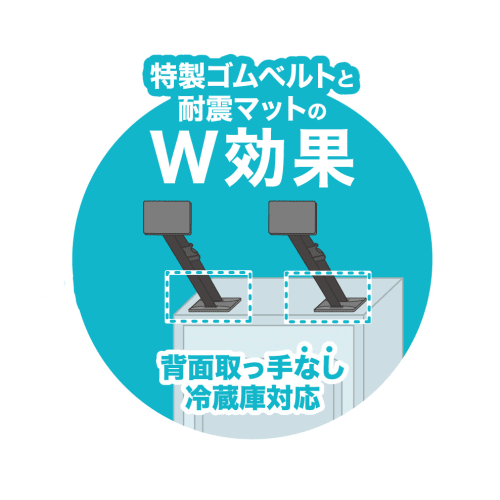 2タイプ展開で幅広い冷蔵庫に対応。-背面タイプ:冷蔵庫の背面の取っ手を利用して固定 -天面タイプ:冷蔵庫を動かさず天面を利用して固定(既に設置済、取っ手がないモデルに対応)環境保全に配慮したハイスペックモデルのバイオマスマットを使用 耐用年数は8~10年
