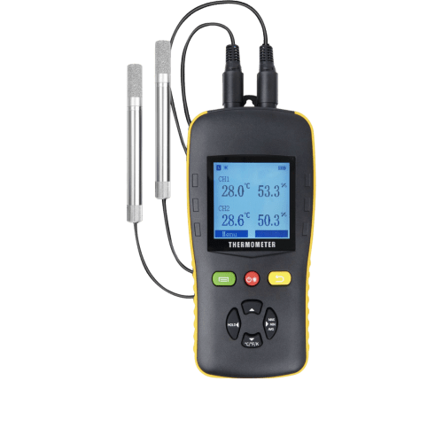 外部プローブを使用して、-40~125℃まで、2チャンネルの測定、記録が可能な温湿度ロガーです。測定精度が高く、応答速度が速いSHT45温湿度センサーの外部プローブが2本付属しています。