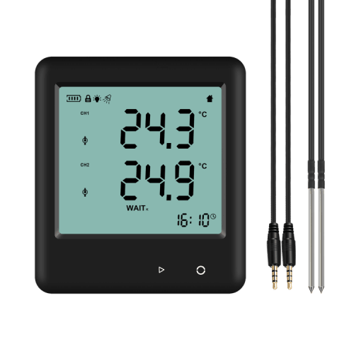 外部温度プローブが2本付属しているため、冷凍庫や恒温槽など複数の対象の温度データが必要な場合に有効です。