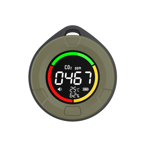 換気のタイミングを音と色でお知らせします。ボタンを2秒間押し続けるとテストが開始され、素早く測定 できます。