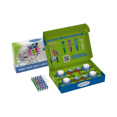 SCATセーフティキャップは、HPLCへの溶媒の安全な供給を可能にする密閉キャップです。スターターキットは、最大4本の保存ボトルをプラグアンドプレイで接続できるソリューションで、価格もお手頃です。HPLCシステムの初期導入に最適です。GL45ネジ付きのSCATセーフティキャップは、SCHOTT、DURAN、WHEATON、KIMBLE (DWK)などのラボボトルに適合します。