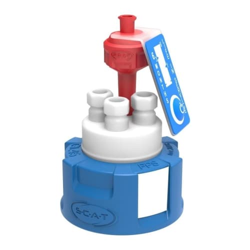 SCATセーフティキャップは、分取HPLCへの溶媒の安全な供給を保証する密閉キャップです。スクリューキャップの接続部は、大口径および大流量に対応するよう特別に設計されています。GL45ネジ山を備えたSCATセーフティキャップは、SCHOTT、DURAN、WHEATON、KIMBLE (DWK)などのラボボトルに適合します。