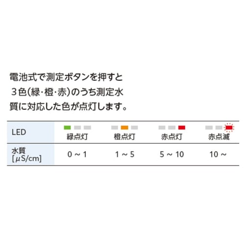 電池式で測定ボタンを押すと3色(緑・橙・赤)のうち測定水質に対応した色が点灯します。