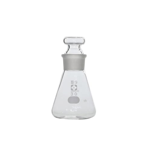 口元に、ガラス製の共通すり合わせ共栓が付属した三角フラスコです。30mLには目安目盛は付いていません。