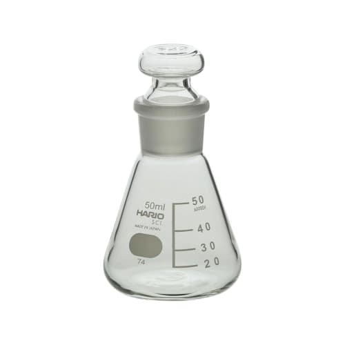 口元に、ガラス製の共通すり合わせ共栓が付属した三角フラスコです。目安となる目盛りが付いています。