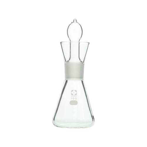 共栓部分の上に液を溜められるような構造になっている、ガラス製の共通すり合わせ三角フラスコです。よう素滴定に用います。