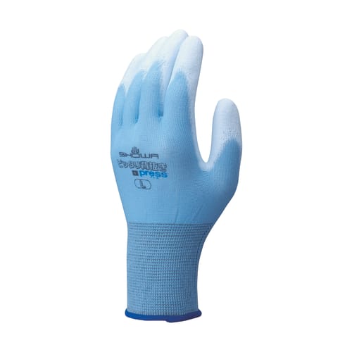 手の平に発泡ウレタンをコーティングし、独自のS-press仕上げを施した通気性に優れた背抜き手袋です。※S-press仕上げは、SHOWA独自のS字パターンによるプレス加工です。