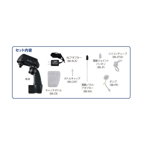 本体、ACアダプター、キャッチボトル、ボトルキャップ、電動ノズルアダプター、電動ジョイントパッキン、シリコンチューブ、ポンプ |