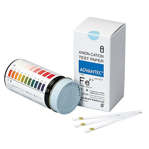 発色試薬類を含んだ試験紙と、そこに吸収される検体中のイオンとの特有の発色反応により、イオンを検出すると同時に、付属の標準変色表と比較し濃度が測定できる試験紙です。スティックの先にイオン検出部、手元側にpH測定部が貼付してあり、イオンの検出、濃度測定と共にpHmp測定も簡単に行うことができます。