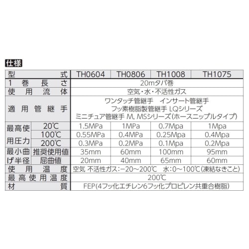 | 0660171731 | FEPチューブ(フッ素樹脂) ミリサイズ(THシリーズ) TH1075R-20 | 66,440 円 | 価格はログイン後に確認出来ます |