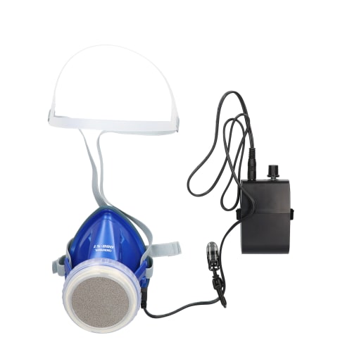 吸気補助具で、呼吸を補助し息苦しさを軽減!送風により顔面との隙間から粉じん侵入を制御。