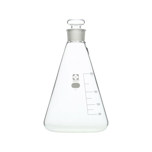 口元に、ガラス製の共通すり合わせ共栓が付属した三角フラスコです。