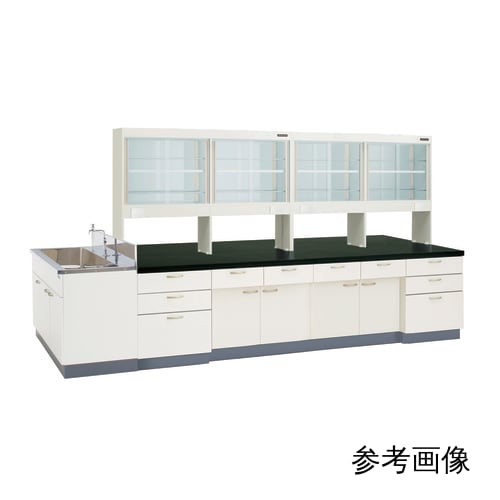 ガラス戸上置棚タイプ:ガラス戸上置棚と流し台付の実験台。中央部はけこみ型となっており、立ち作業・座り作業どちらにもご使用できます。
