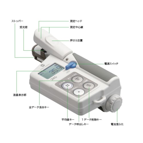 | 表示 | 測定値:LCDデジタル4桁表示(小数点以下1位まで) 測定回数:LCDデジタル2桁表示 |